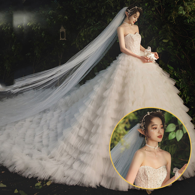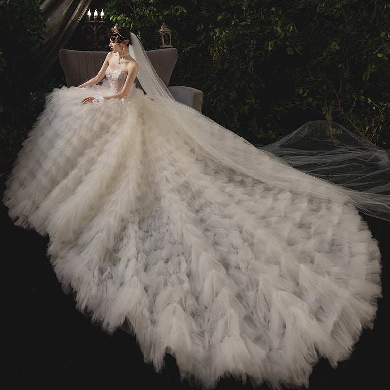 Combines the modesty of a structured bodice with the high-fashion drama of a floor-sweeping train. |